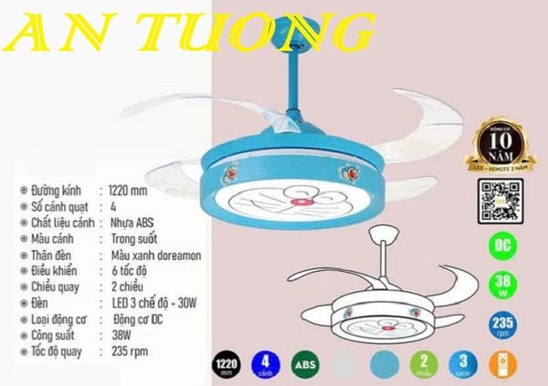 Quạt trần đèn cho phòng bé trai dễ thương màu xanh hình doremon
