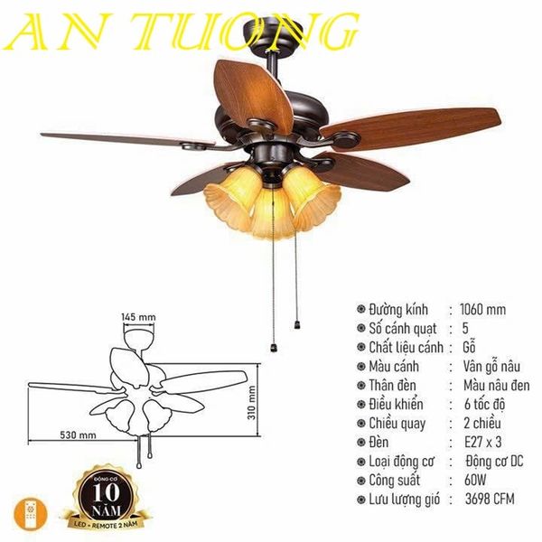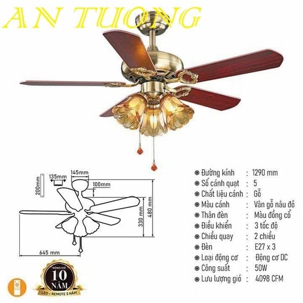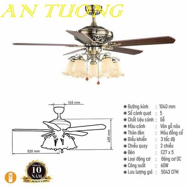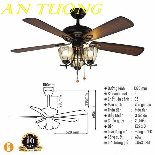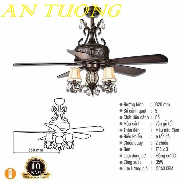 – Chất liệu đồng nguyên khối, phù hợp biệt thự châu Âu. - Quạt trần đèn chùm gỗ tự nhiên Vintage Style